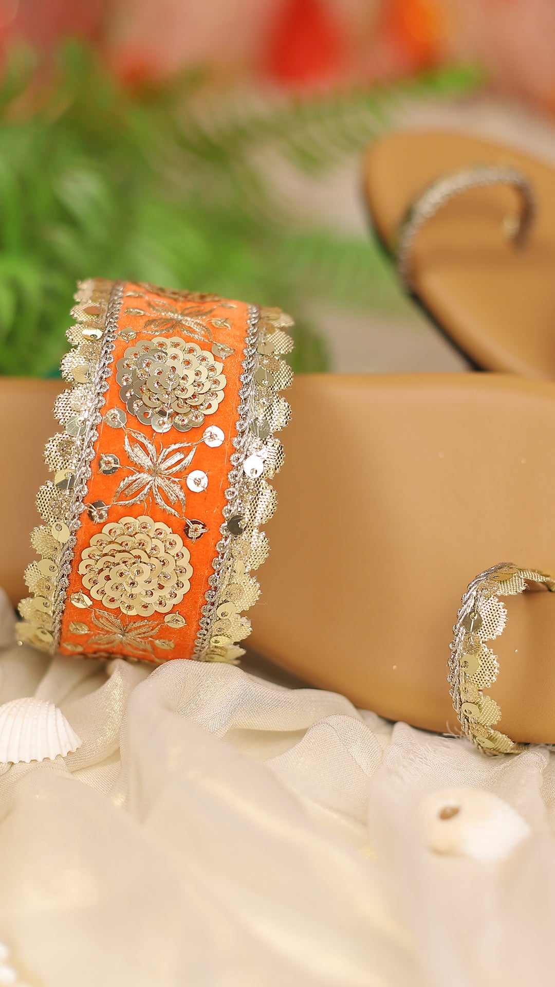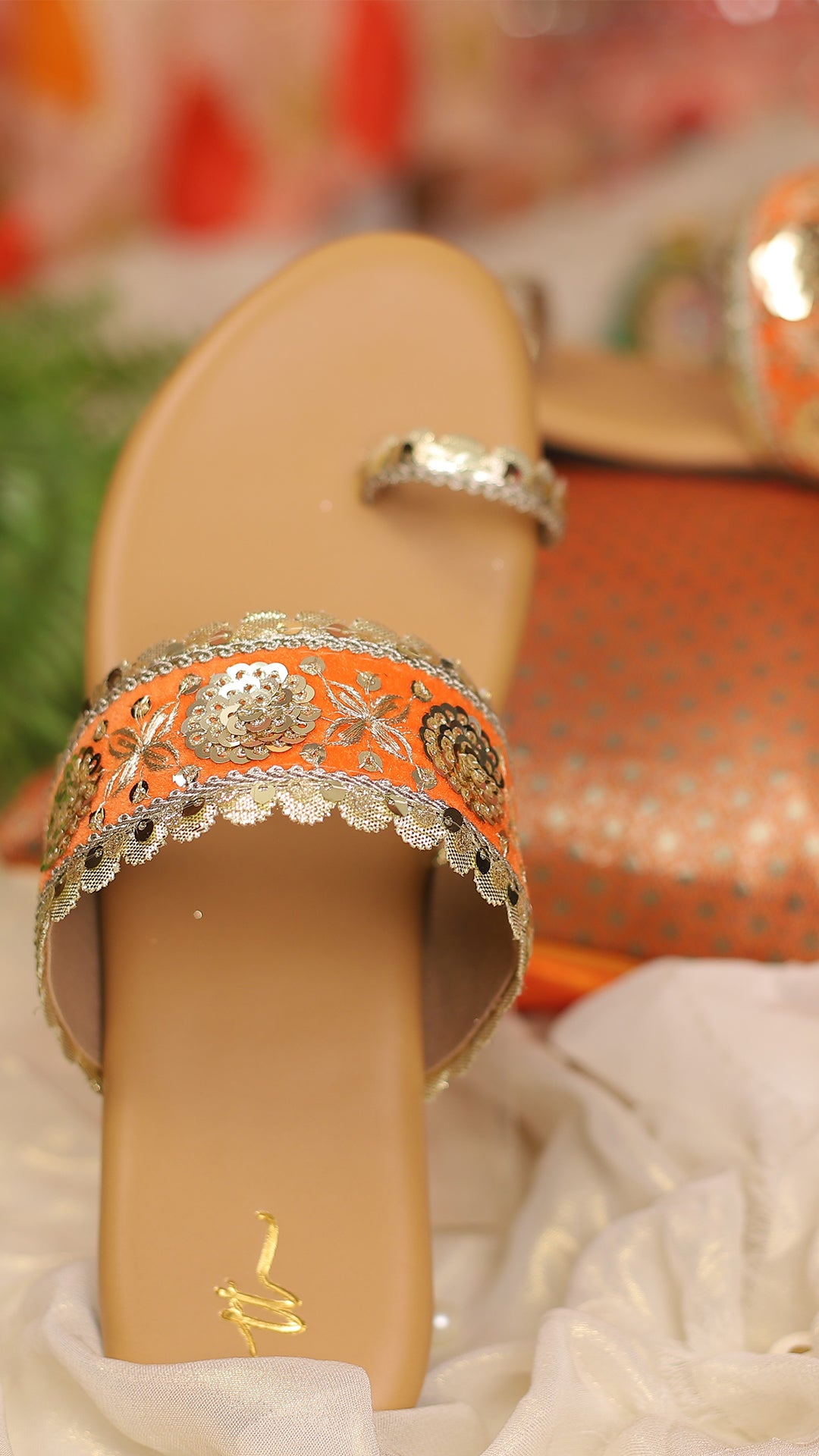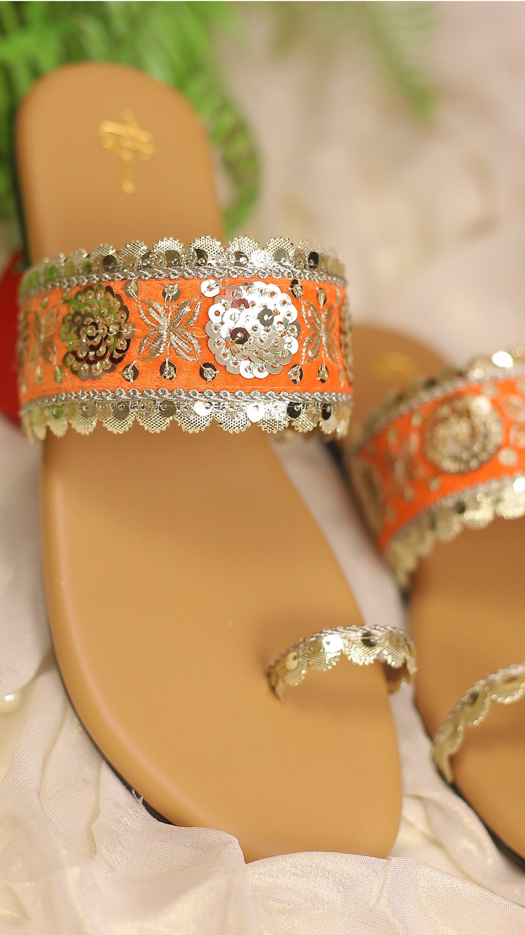 For those who love a blend of tradition and chic style, Saanjh brings a perfect combination of a Chiku brown base with a vibrant orange upper. Intricately embroidered with golden sequins forming delicate flowers and leaves, this piece is designed to add a touch of elegance to your festive wardrobe. Whether for celebrations or casual festivities, this Kolhapuri flat embodies timeless charm.