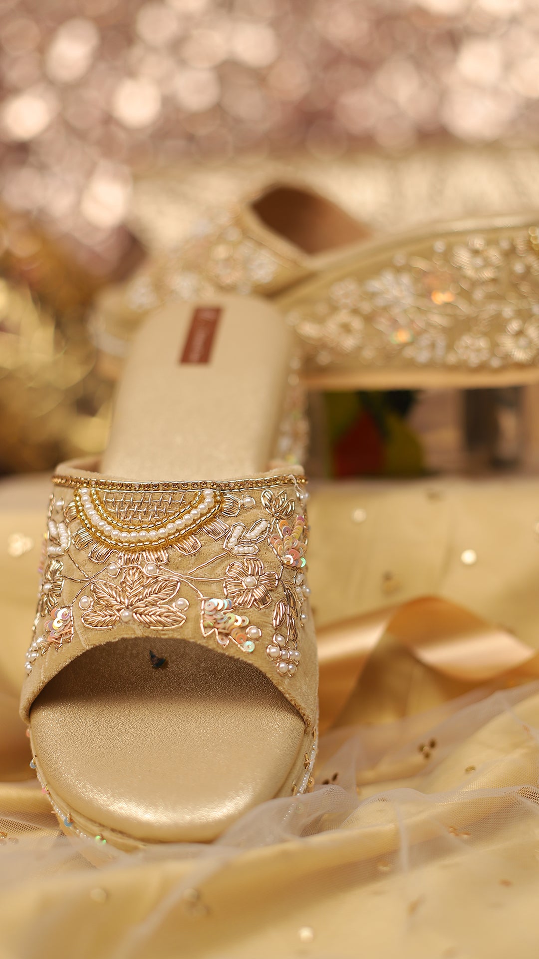 Elevate your wedding look with these luxurious Wedding Wedges, featuring a radiant golden leather base and an exquisitely embellished upper with intricate zari and pearl detailing. Designed with a comfortable wedge heel, these shoes perfectly combine elegance and ease, making them ideal for long wedding ceremonies or festive occasions. The rich golden hue and traditional embellishments make this pair an outstanding choice for bridal or occasion wear, effortlessly adding a touch of regal charm to any outfit.