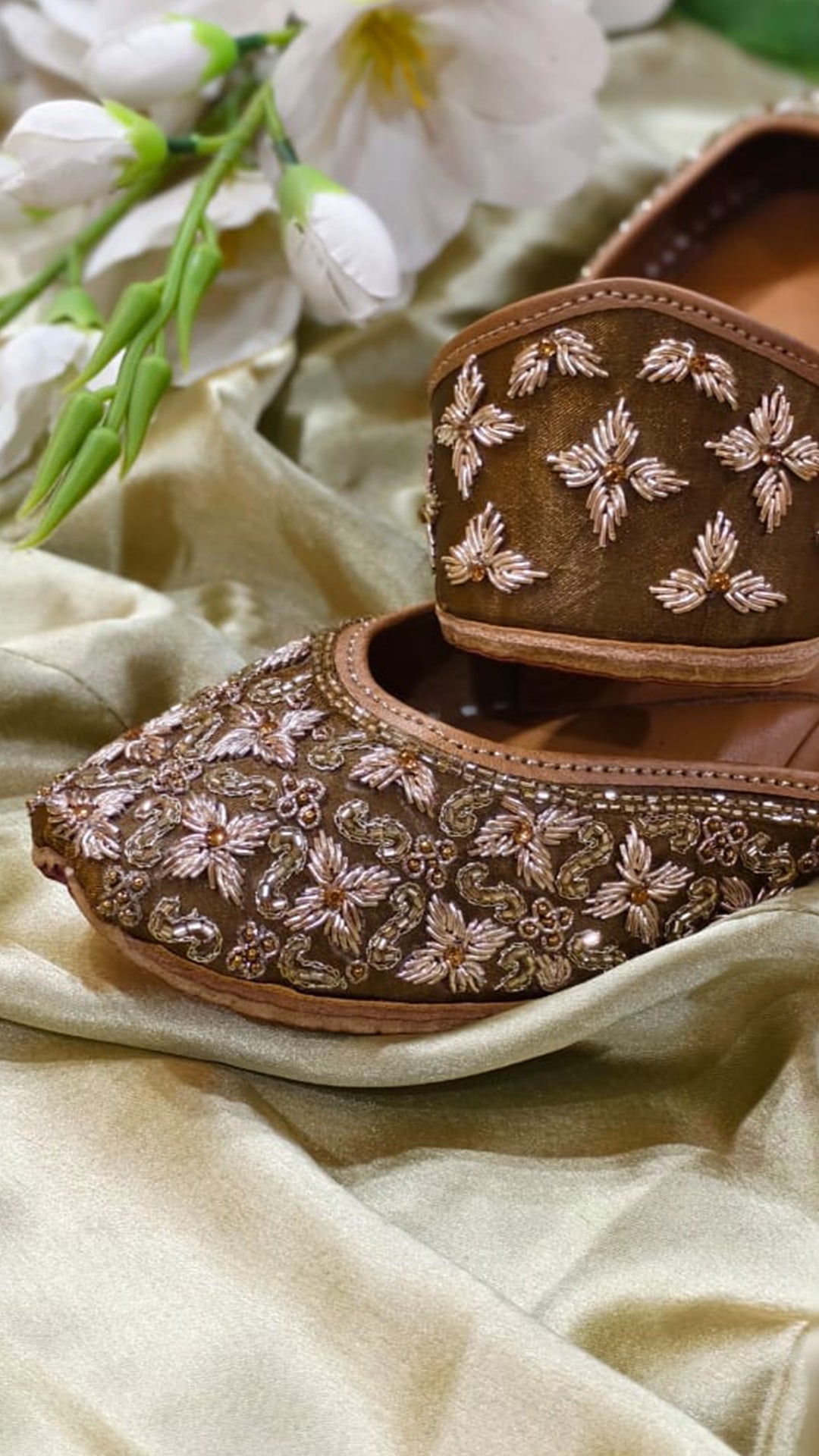 Step into style with the "Earthly Olive" Jutti crafted from luxe silk and decked with dazzling rose gold Zardozi kadhai, this olive stunner is your go-to for every occasion. The Jalwa-inspired design brings the perfect blend of glam and tradition, making it a must-have for festive vibes or a chic everyday look!