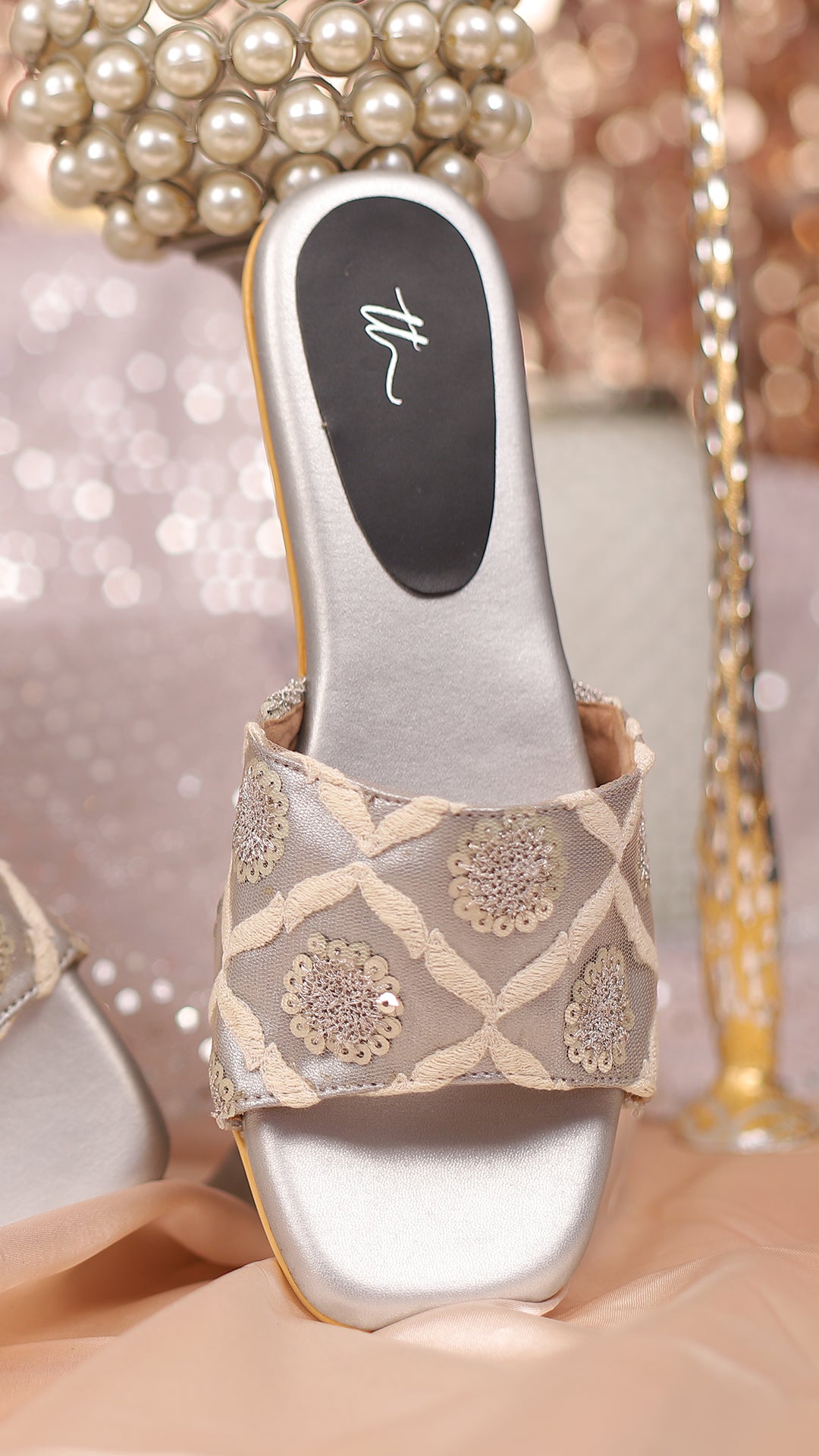 Add a touch of elegance to any occasion with Fiora Heels, featuring a sophisticated silver base paired with a delicate 1-inch block heel. The upper is adorned with a shimmering silver finish and intricate white embroidery, creating a refined yet dazzling look. Perfect for party or wedding wear, these heels strike the ideal balance between glamour and comfort, making them an essential addition to your footwear collection