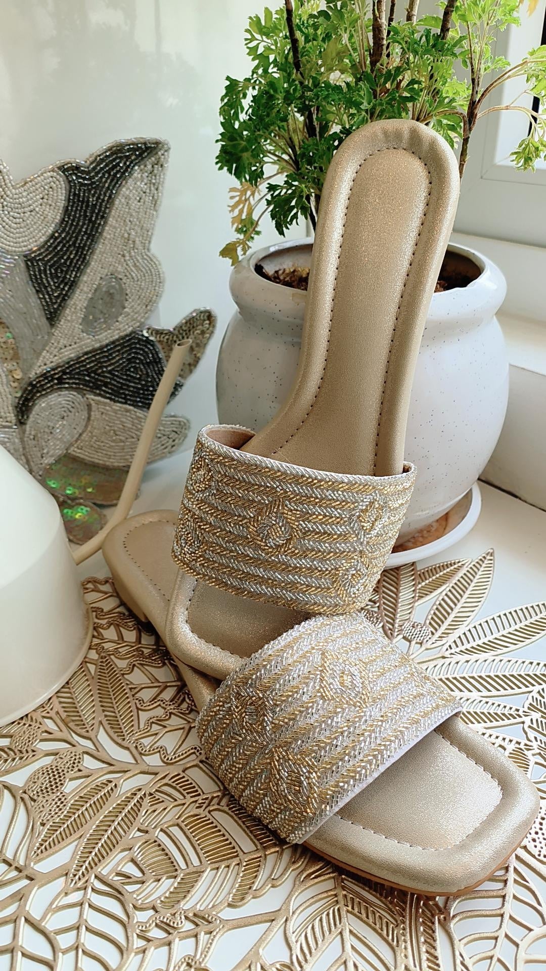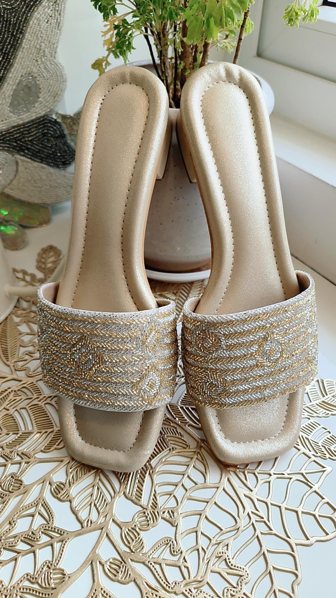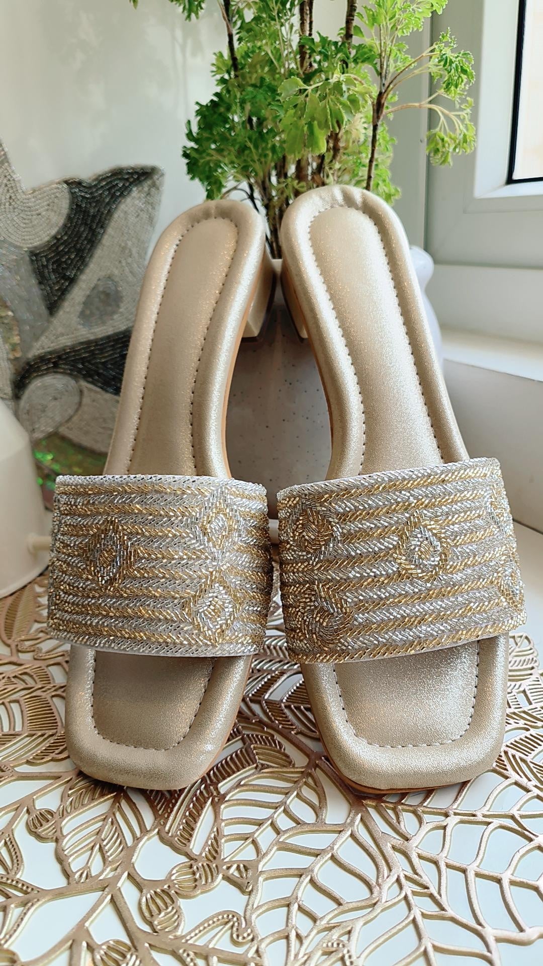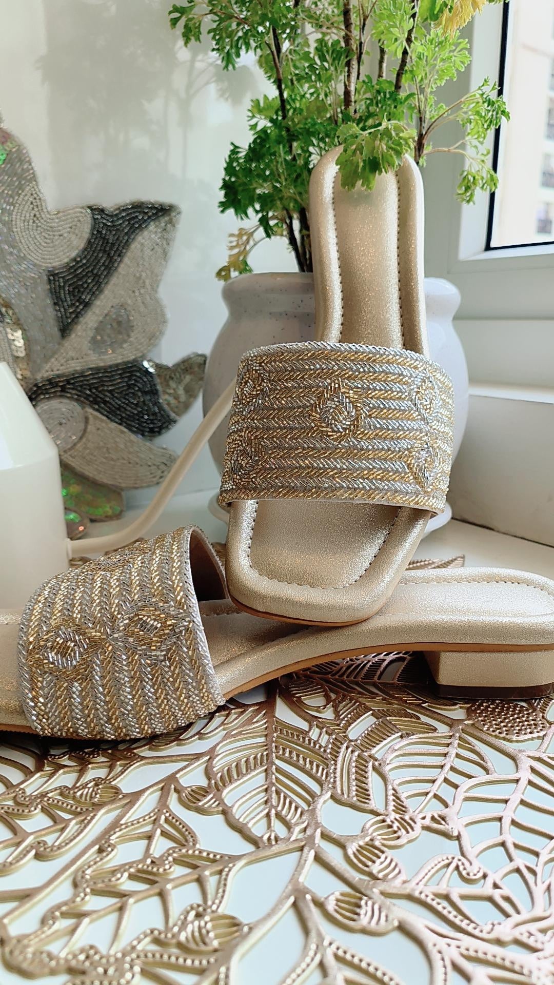 Soft and romantic, the Petal Whisper slider is an ode to nature's beauty. With a white-beige base adorned with delicate pink flowers and golden embroidery, this slider offers an effortlessly feminine touch to both festive and casual attire