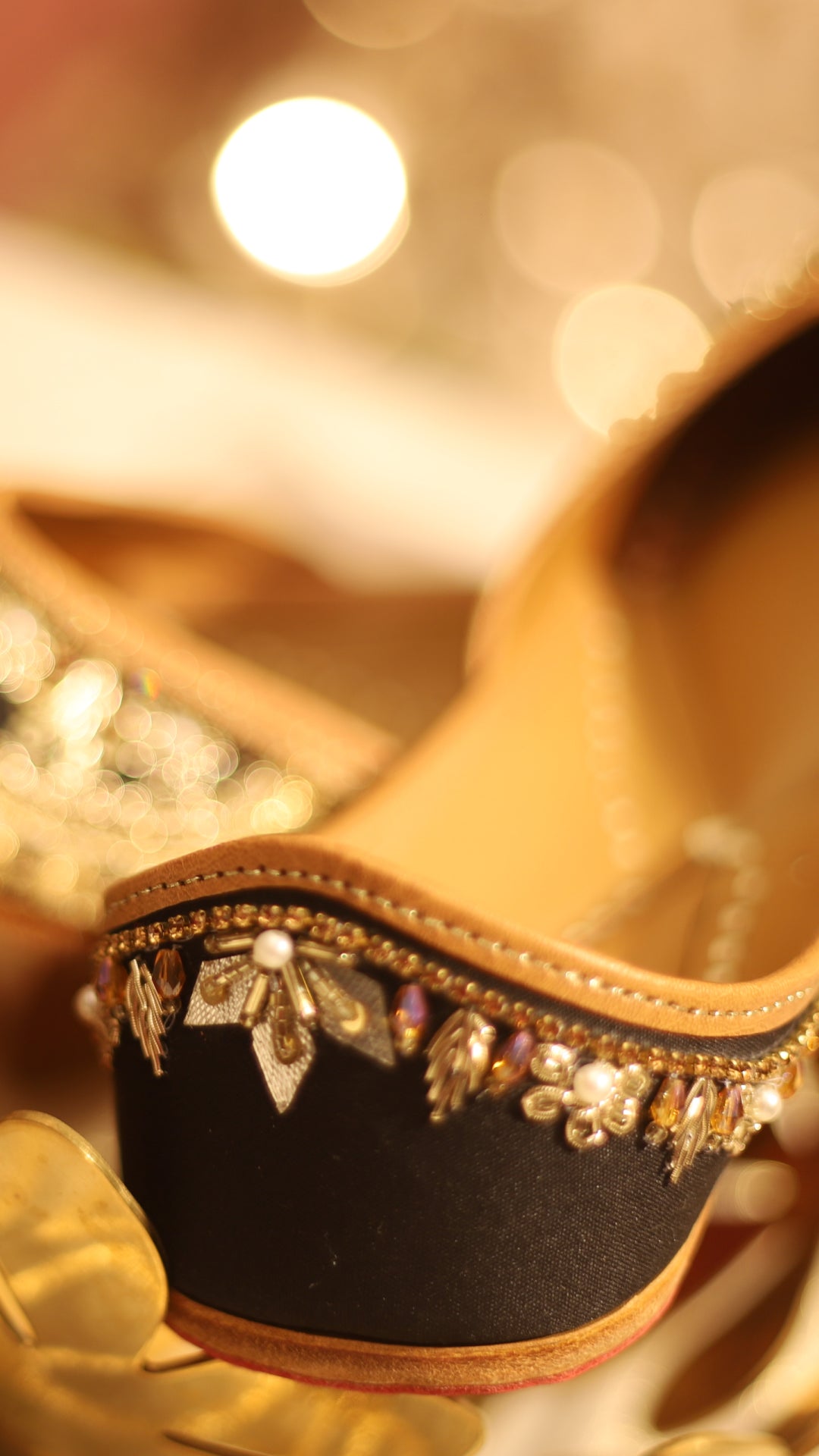 Experience the timeless grace of Kaaya, where the richness of black meets the splendor of intricate golden embroidery. Elegant yet bold, this Jutti is a celebration of luxurious craftsmanship, making it a perfect pick for festive evenings, weddings, or traditional gatherings. Slip into Kaaya to exude a royal charm effortlessly.