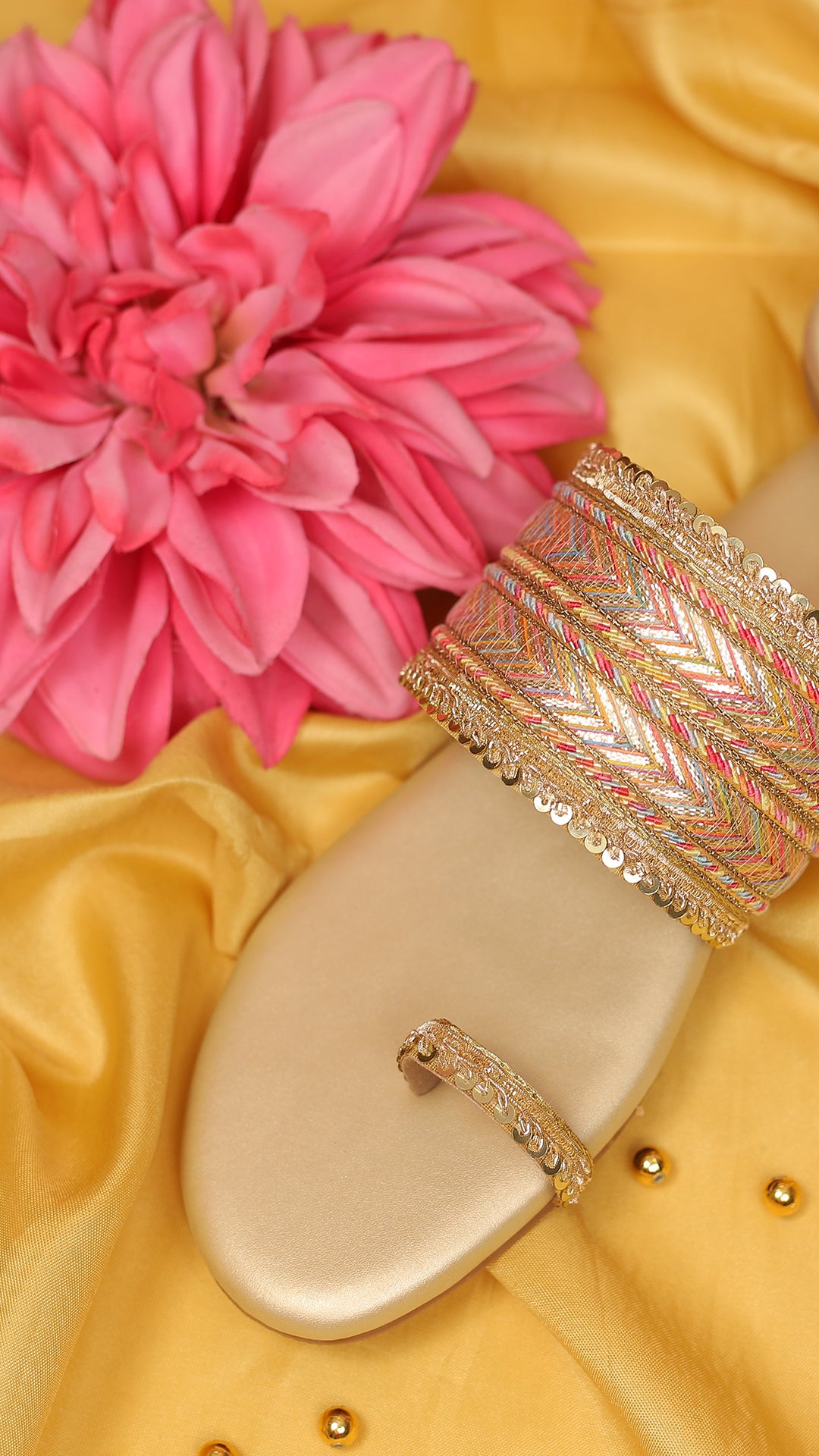 Inspired by the vibrant hues of life, Rangrez is a multicolored masterpiece with shades of blue, red, and yellow, intricately detailed with delicate sequins. Ideal for those who adore a splash of color, this Kolhapuri flat is a perfect match for playful and chic festive looks.
