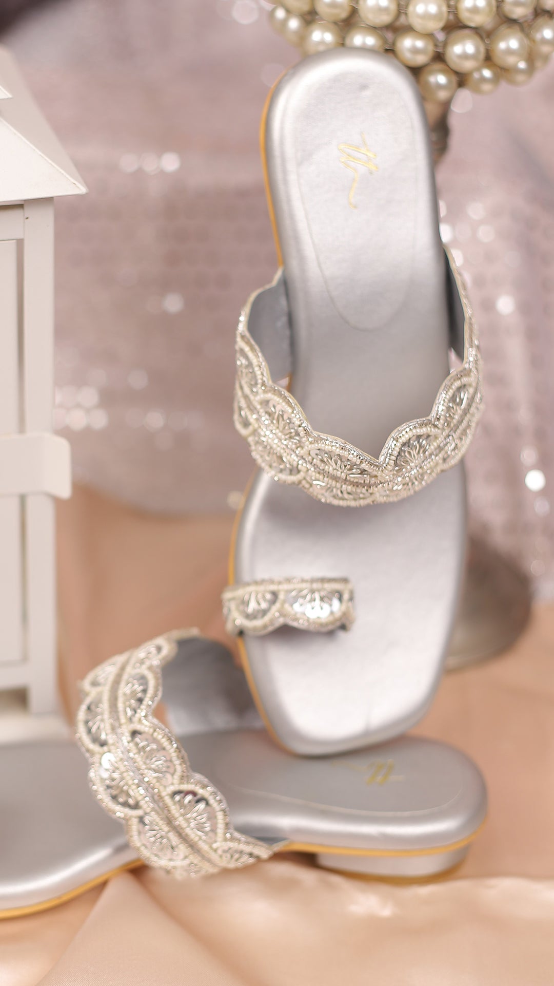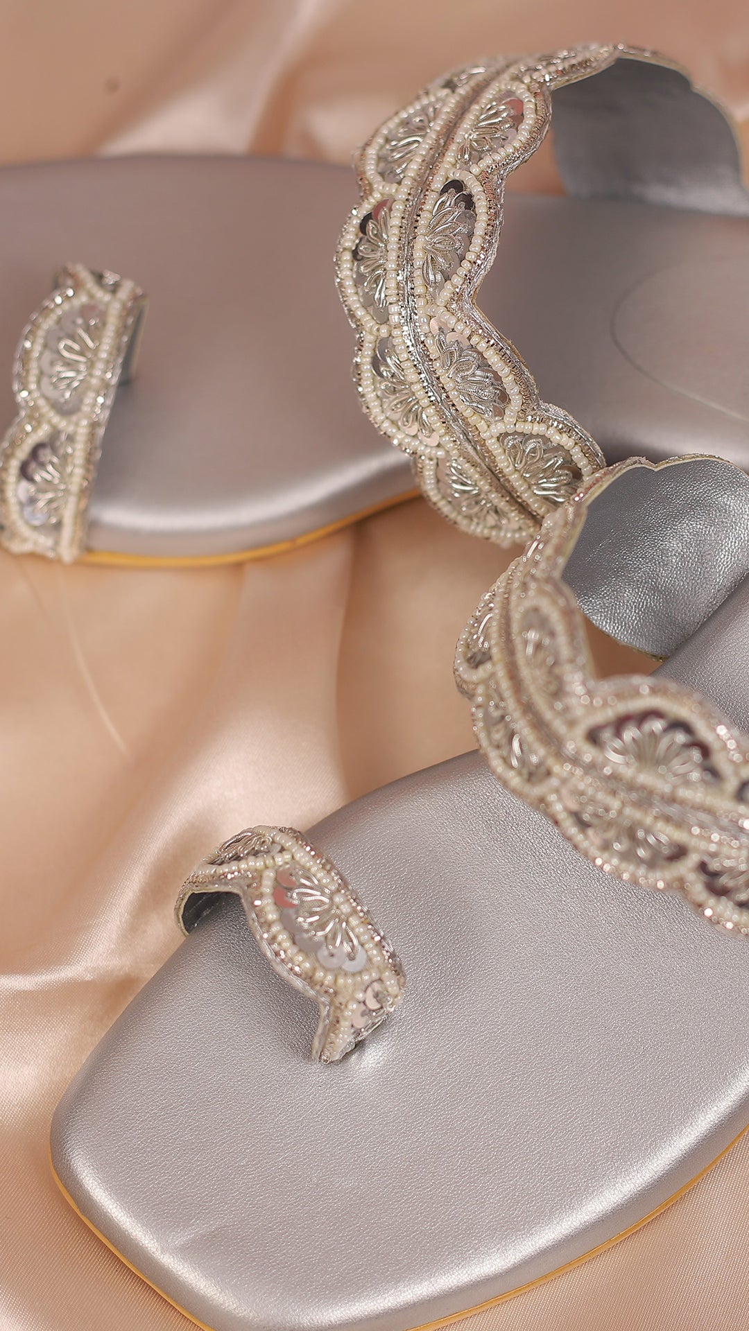 An ode to grace and sophistication, Starlight Chic features a muted greyish-silver base adorned with delicate white pearl beads. This Kolhapuri embodies subtle elegance with its radiant finish, making it an impeccable choice for ethnic outfits like sarees and salwar suits. Whether you're attending a wedding or festive gathering, this pair adds a touch of refined glamour to any look.