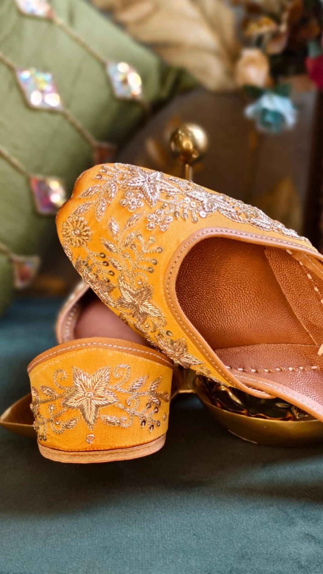 Care: For long-lasting beauty, dry clean only. Store your Juttis in the dust bag or wrap them in muslin cloth to preserve their elegance. Avoid moisture exposure, but if they do get wet, ensure they are thoroughly dried before returning them to your wardrobe.