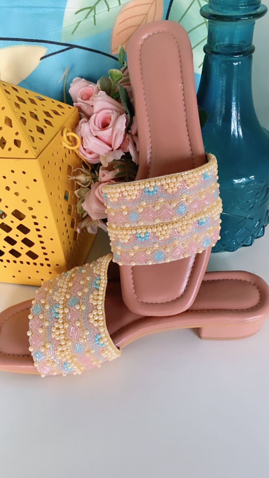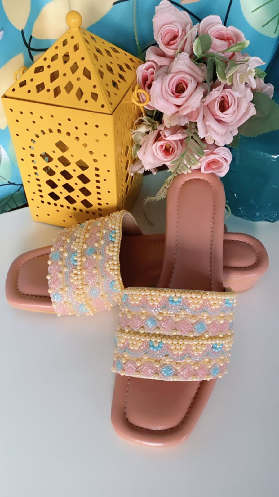 Radiant and charming, the Sunlit Pink slider is adorned with yellow and blue beadwork on a soft pink base. Whether styled with jeans or a flowy dress, this slider offers a youthful, chic vibe perfect for everyday elegance.
