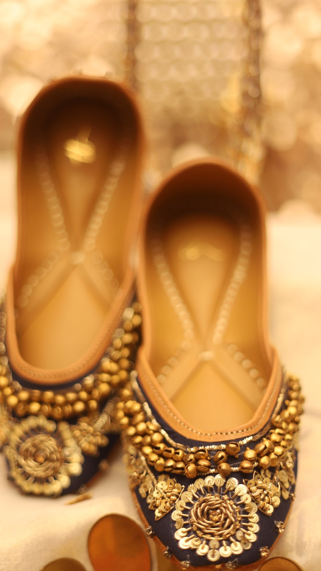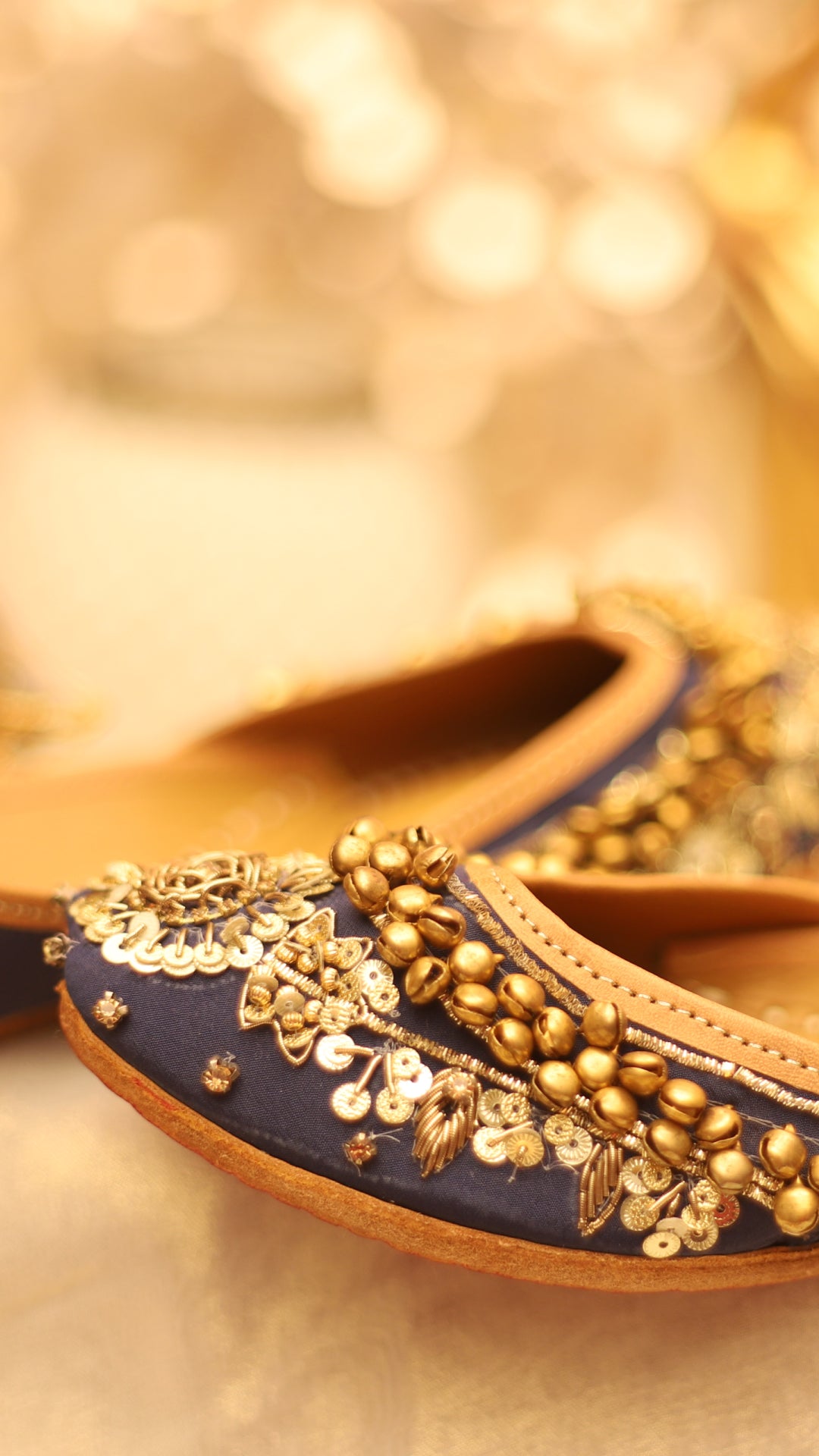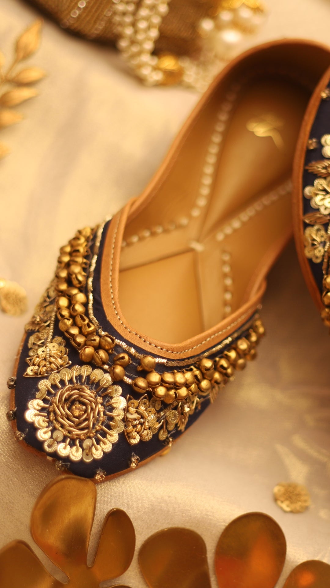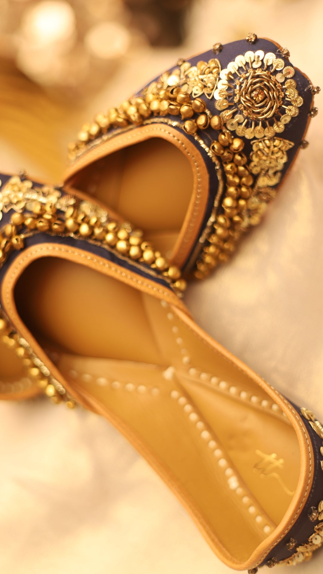 Celebrate tradition and festivity with Tarana, a royal blue Jutti adorned with delicate gungroo work that jingles with every step you take. The deep, rich blue symbolizes royalty, while the subtle sound of gungroos brings music to your celebrations. Perfect for festive occasions, weddings, or simply when you want to feel special, Tarana is crafted to bring a vibrant and joyful rhythm to your ethnic look.