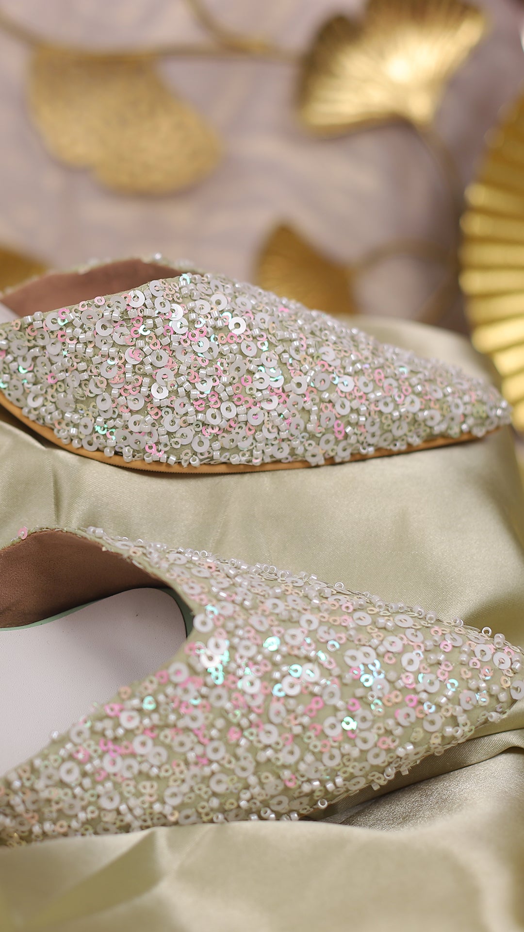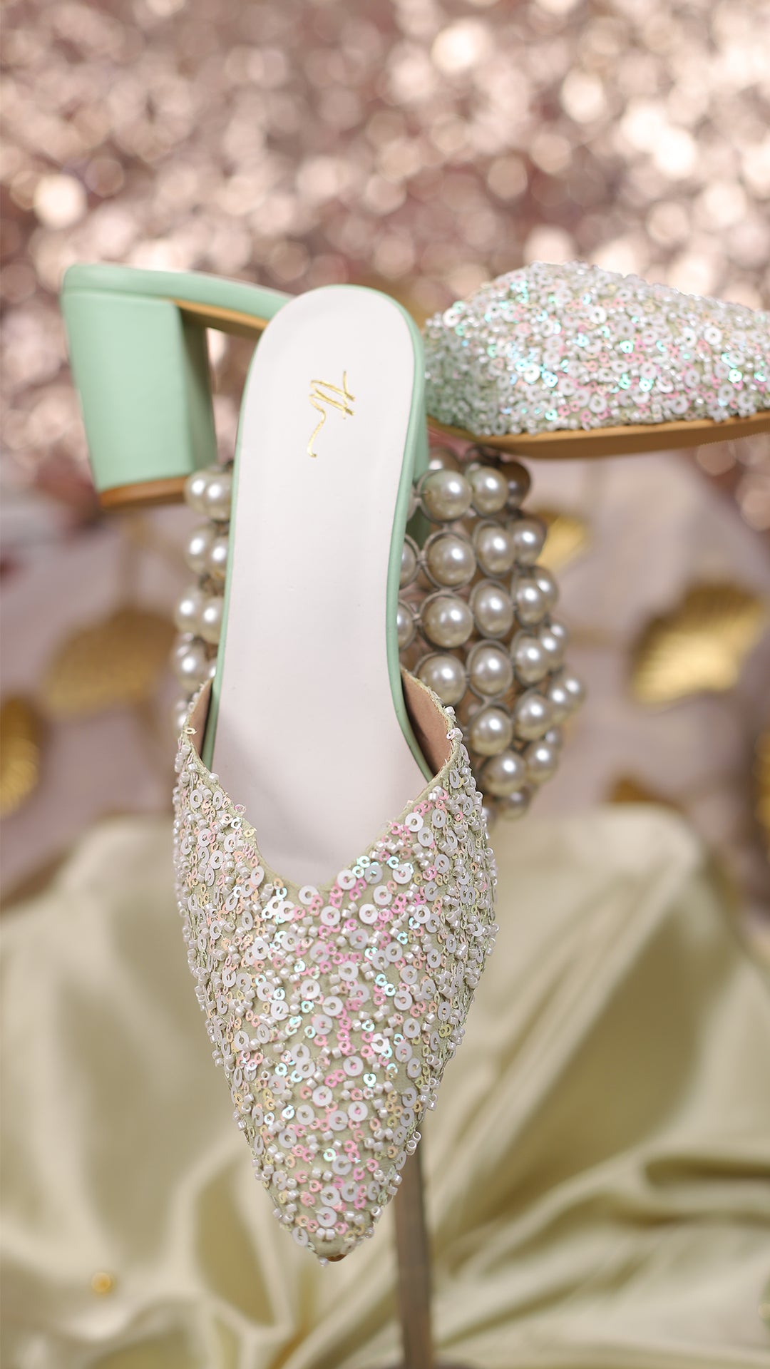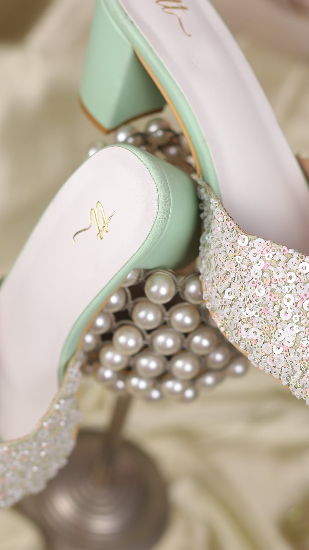 A chic blend of elegance and versatility. Inspired by the delicate beauty of the Zinnia flower, this pair features a mint green base and a 2-inch block heel, embellished with cutdana and sequins for a hint of sparkle. Perfect for any occasion, from day weddings and mehandi to engagements, these heels will elevate your look. Style them effortlessly with an evening gown or stand out at a cocktail party in pure sophistication.